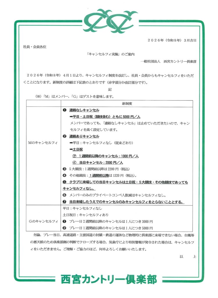 「キャンセルフィ実施」のご案内